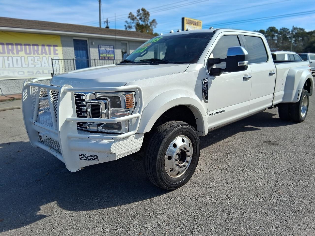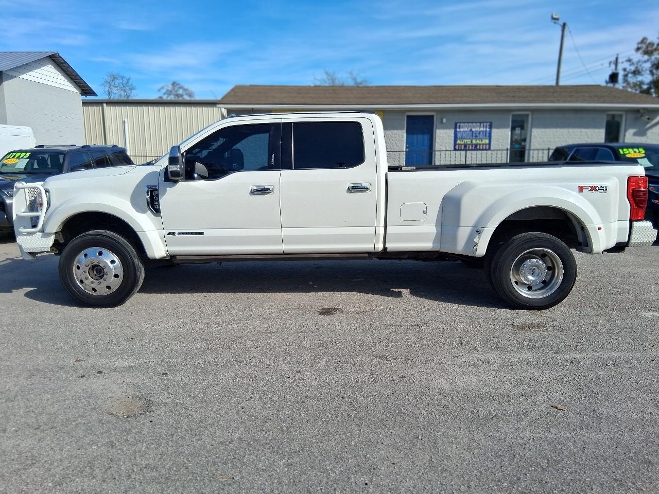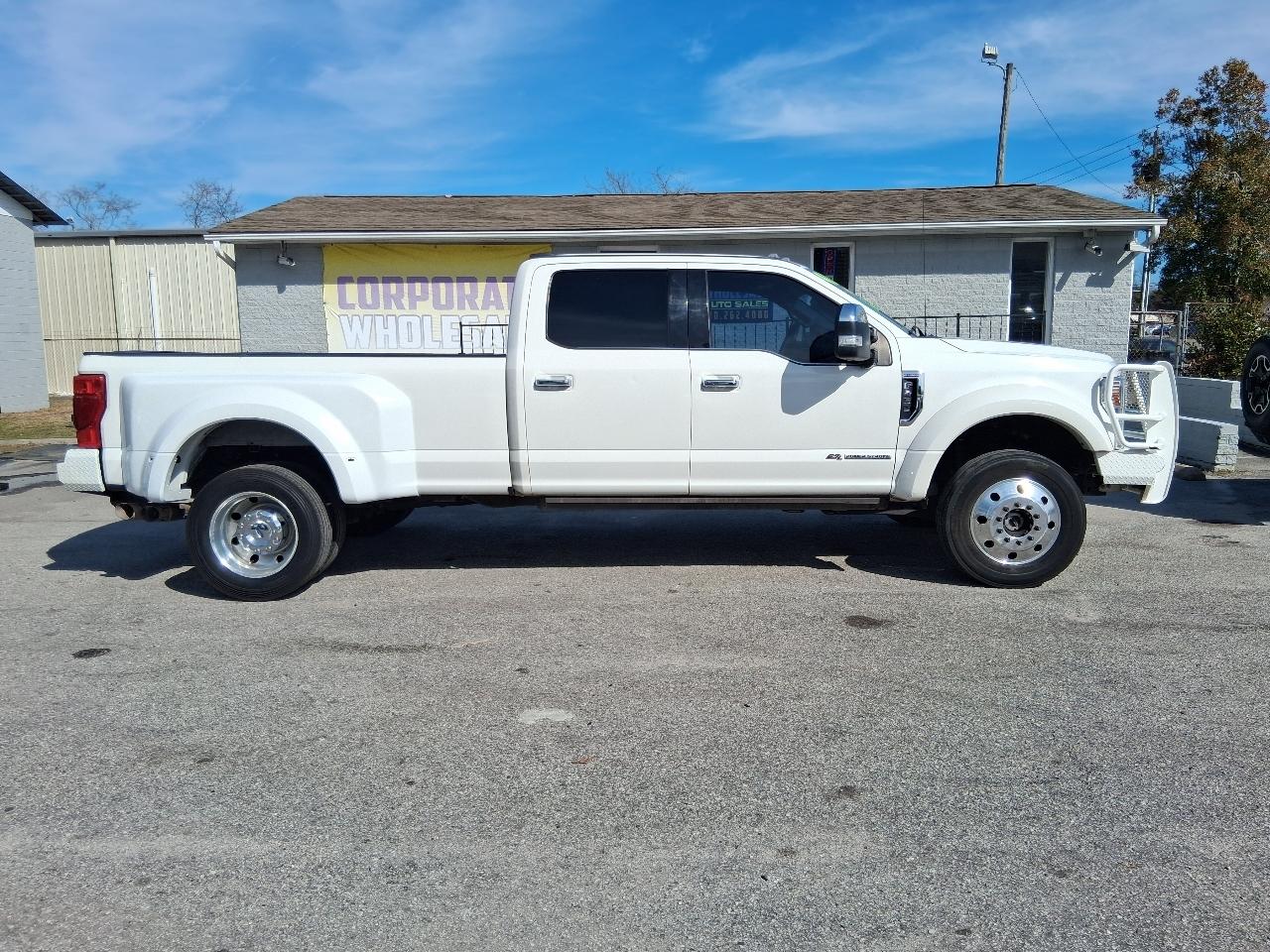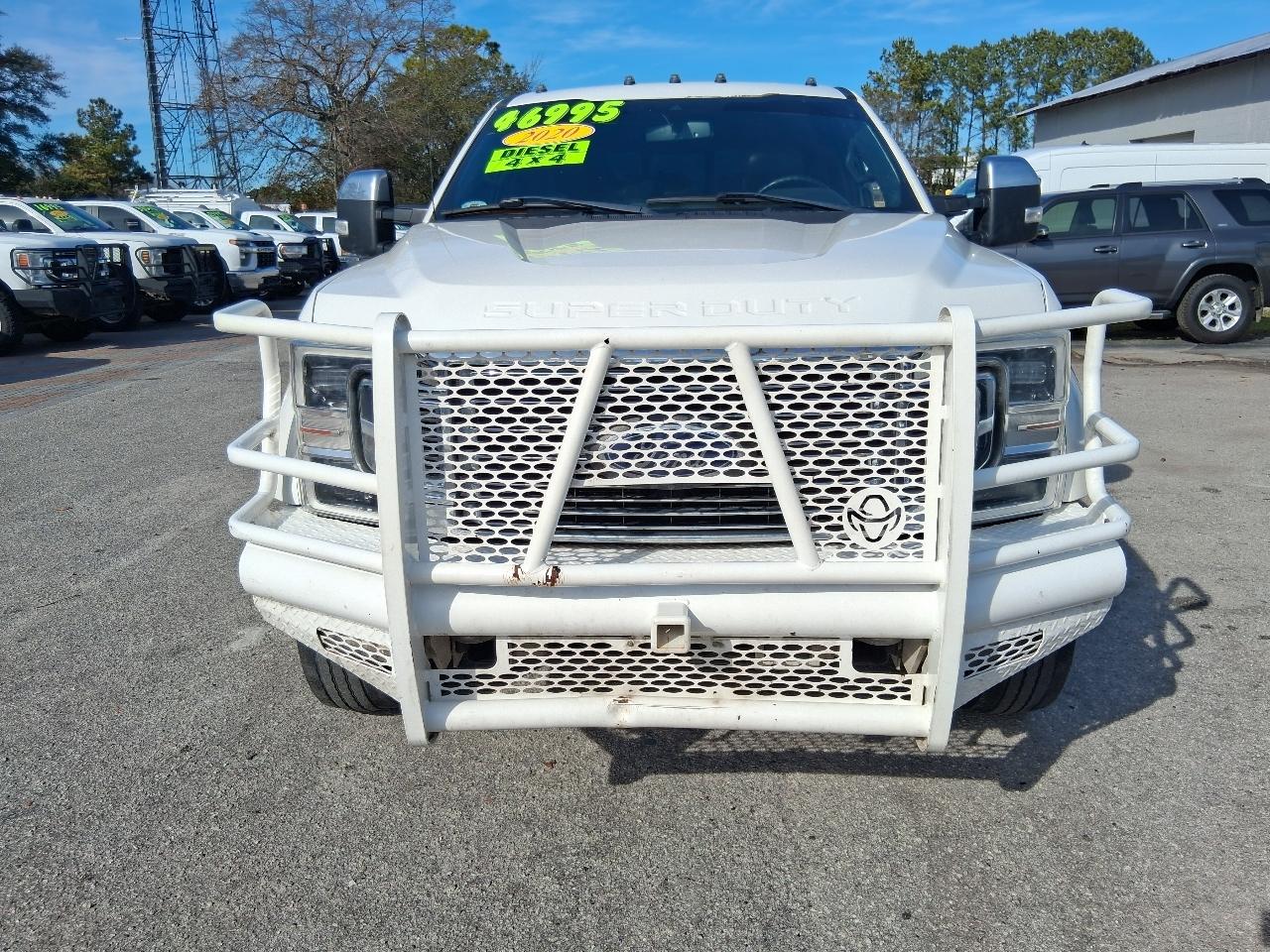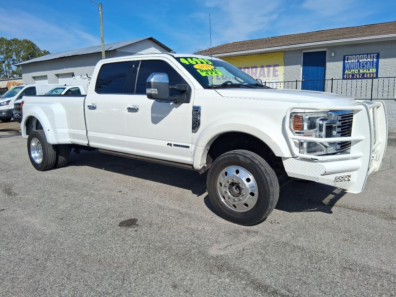 LOADED! EVERY OPTION AVAILABLE! SAVE THOUSANDS! WONT BE HERE LONG AT THIS PRICE! CLEAN TITLE, CLEAN INSIDE AND OUT! SUPER NICE TRUCK! 2020 FORD F-450 PLATINUM SUPERDUTY SUPER CREW CAB 4 DOOR 4X4 4WD DIESEL DUALLY TRUCK, PEARL WHITE METALLIC EXTERIOR W CHARCAOL LEATHER INTERIOR, CORPORATE TRUCK SERVICED UNDER MAINENANCE PLAN, 6.7L TURBO DIESEL ENGINE, ALL POWER OPTIONS INCLUDING POWER MOONROOF/SUNROOF, POWER HEATED AND COOLED LEATHER SEATS, NAVIGATION, REAR BACK UP CAMERA, POWER WINDOWS, DOORS, CRUISE, GOOD TIRES, TOW PACKAGE, 5TH WHEEL GOOSENECK IN BED, DUAL REAR WHEELS W/ PREMIUM FACTORY ALCOA WHEEL PACKAGE W GOOD OVERSIZE TIRES, CHROME PACKAGE W CHROME RUNNING BOARDS, GRILLE AND BUMPERS, 215K HIGHWAY MILES, HURRY! WONT BE HERE LONG! READY TO GO! Call 910-612-6504 or 910-262-4000 OR EMAIL